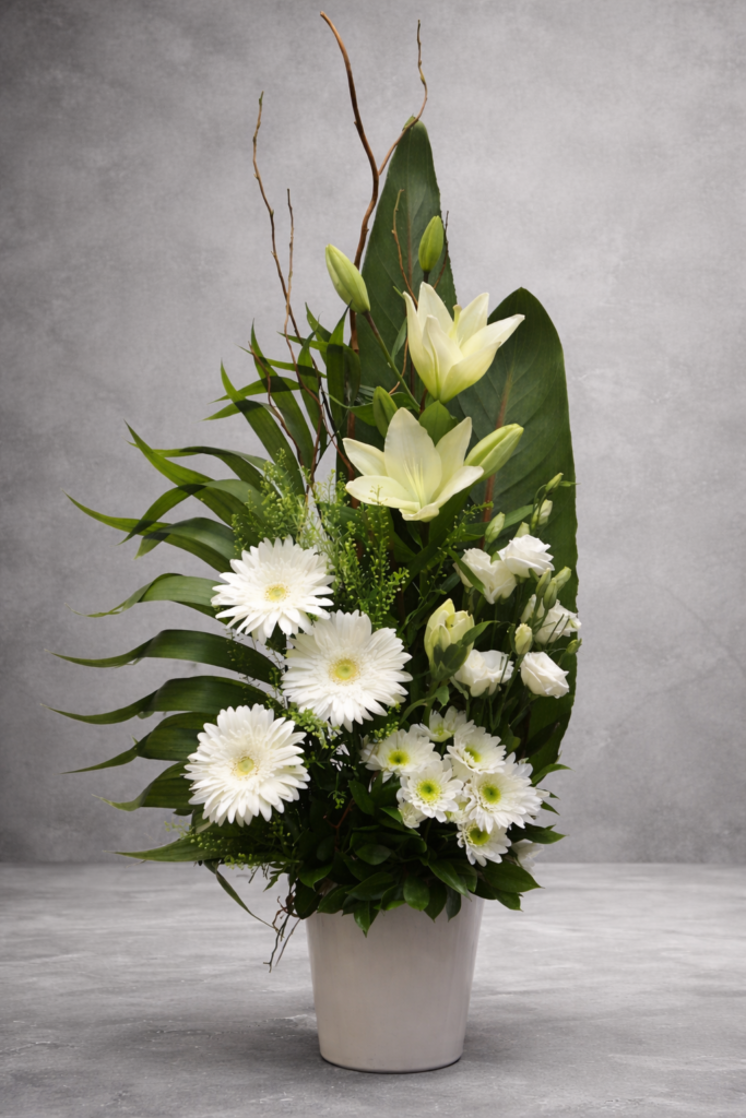 Une composition douce et raffinée de lys blancs, gerberas et fleurs délicates dans un cache-pot blanc.