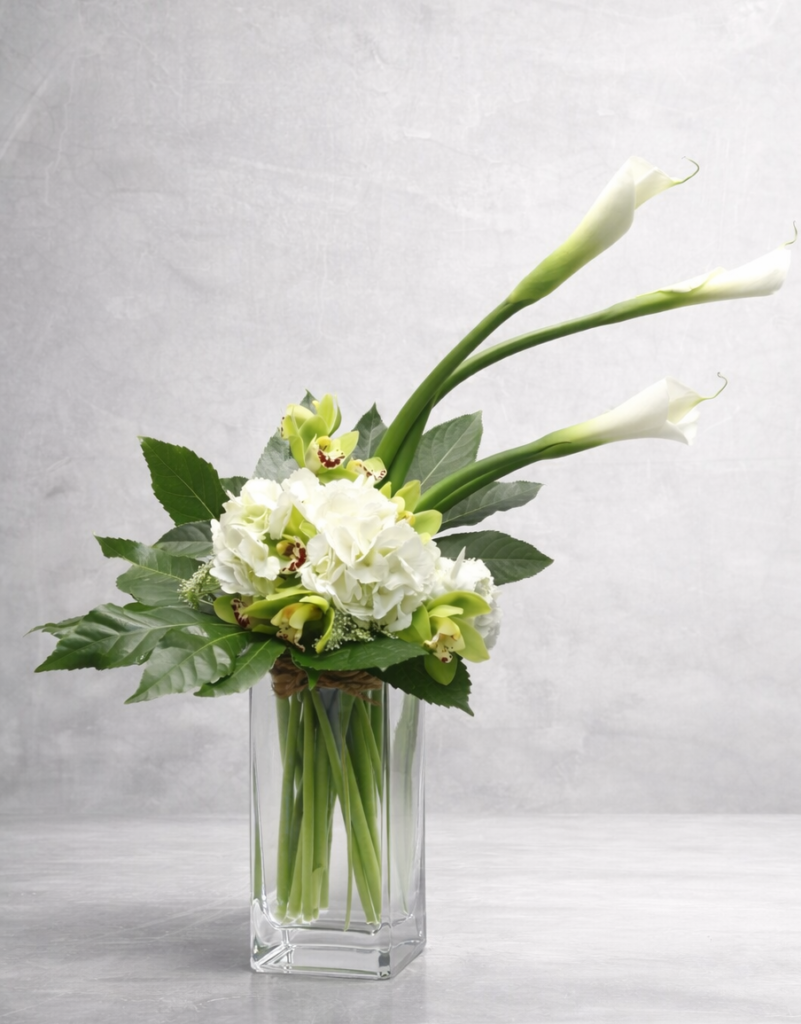 Arrangement élégant de callas blancs, hydrangeas et orchidées dans un vase en verre.