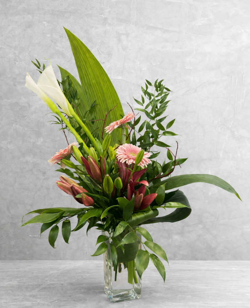 Un bouquet raffiné alliant callas blancs, gerberas délicats et de lys, sublimé par une verdure . Une création moderne et aérienne dans un vase.