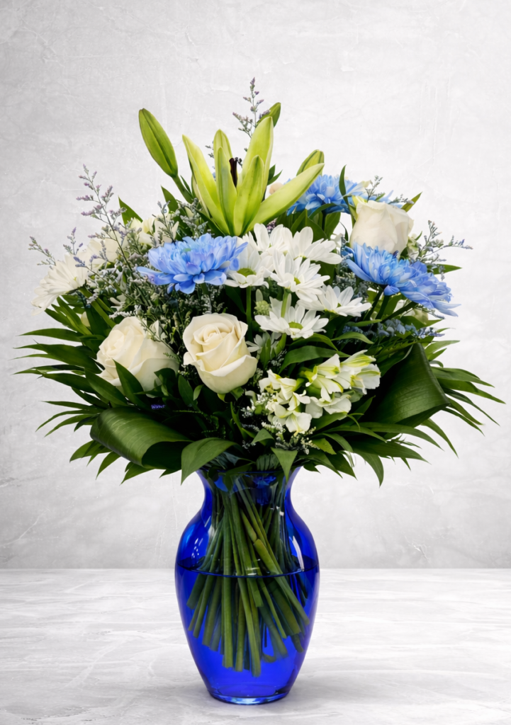 Un beau bouquet dans son vase bleu avec des lys, des roses, des marguerites, des alstroemerias, des fuji teintés de bleu, accompagnés de caspia et de feuillage.