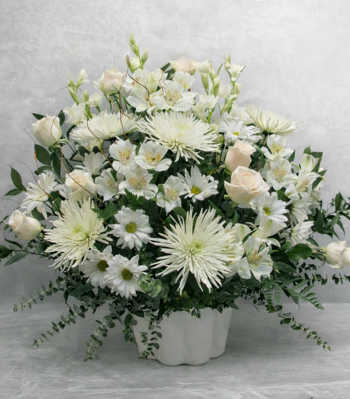 Une composition champêtre et élégante aux tons doux et apaisants, composée de délicates fleurs blanches dans un cache-pot blanc.