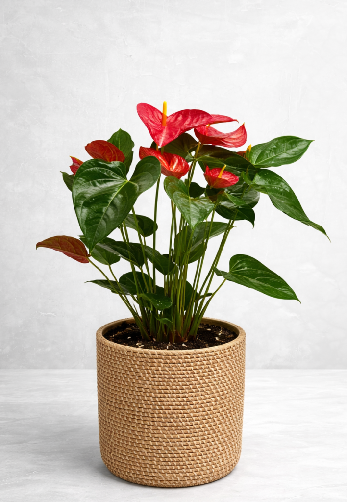 Magnifique plante d’anthurium de 8″ présentée dans un élégant cache-pot.